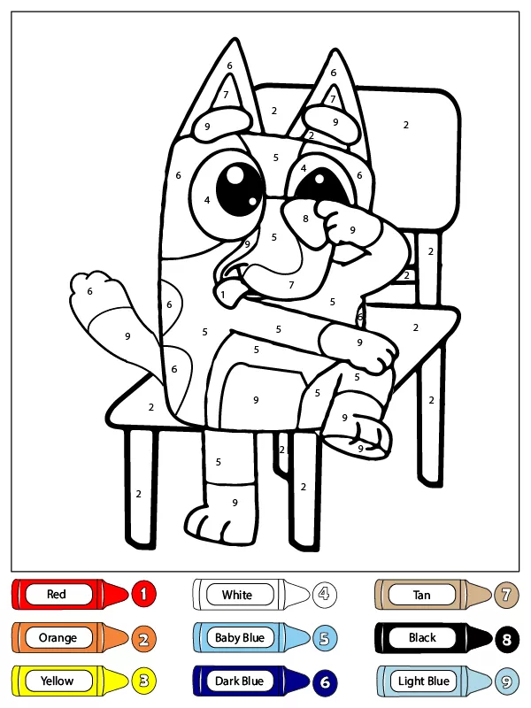 Coloring description : Download Printable Bluey Sitting on a Chair Color by Number Coloring Page