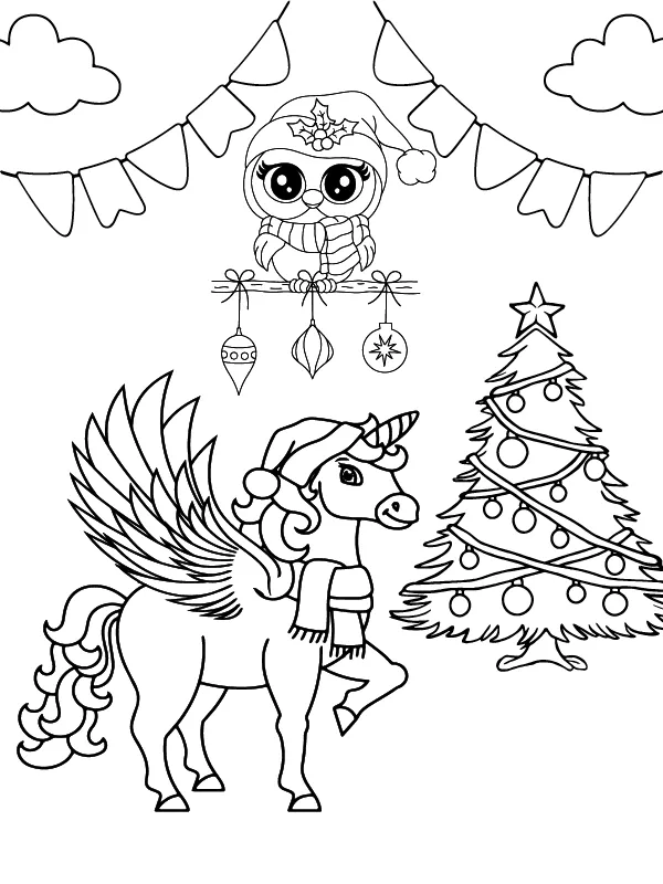 Coloring description : Download Printable Christmas Unicorn and Owl Coloring Page