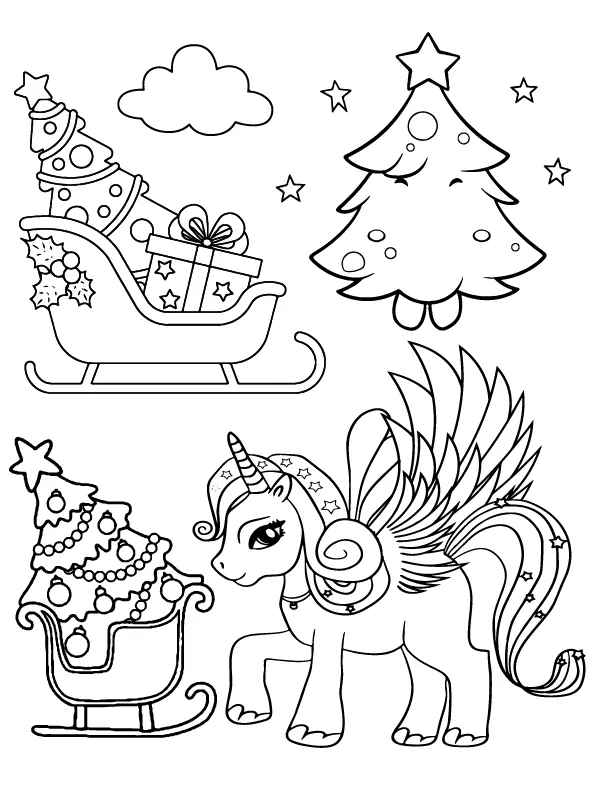Coloring description : Download Printable Christmas Unicorn and Sleigh Coloring Page
