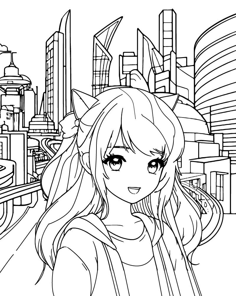 : Druckbar herunterladen Lebendige Stadt Kawaii Anime Malvorlage