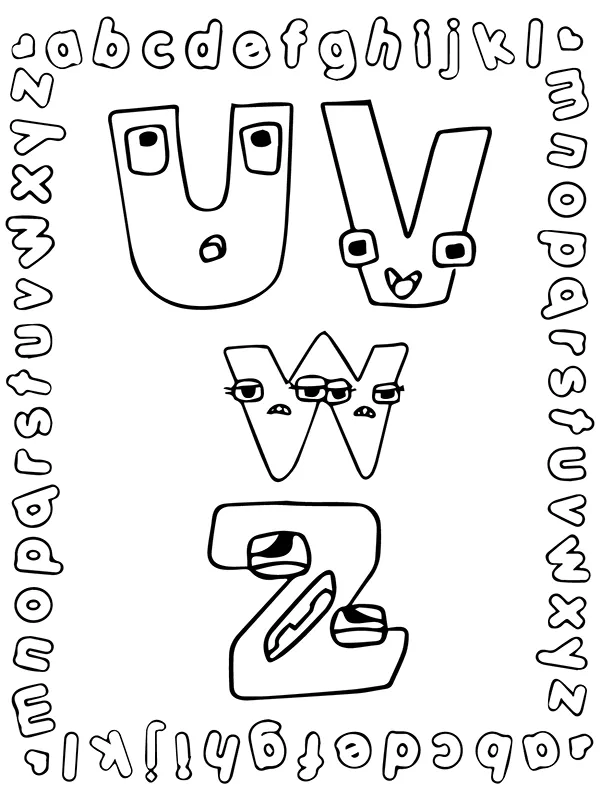 : Druckbar herunterladen Alphabet Lore Buchstaben U, V, W und Z Malvorlage