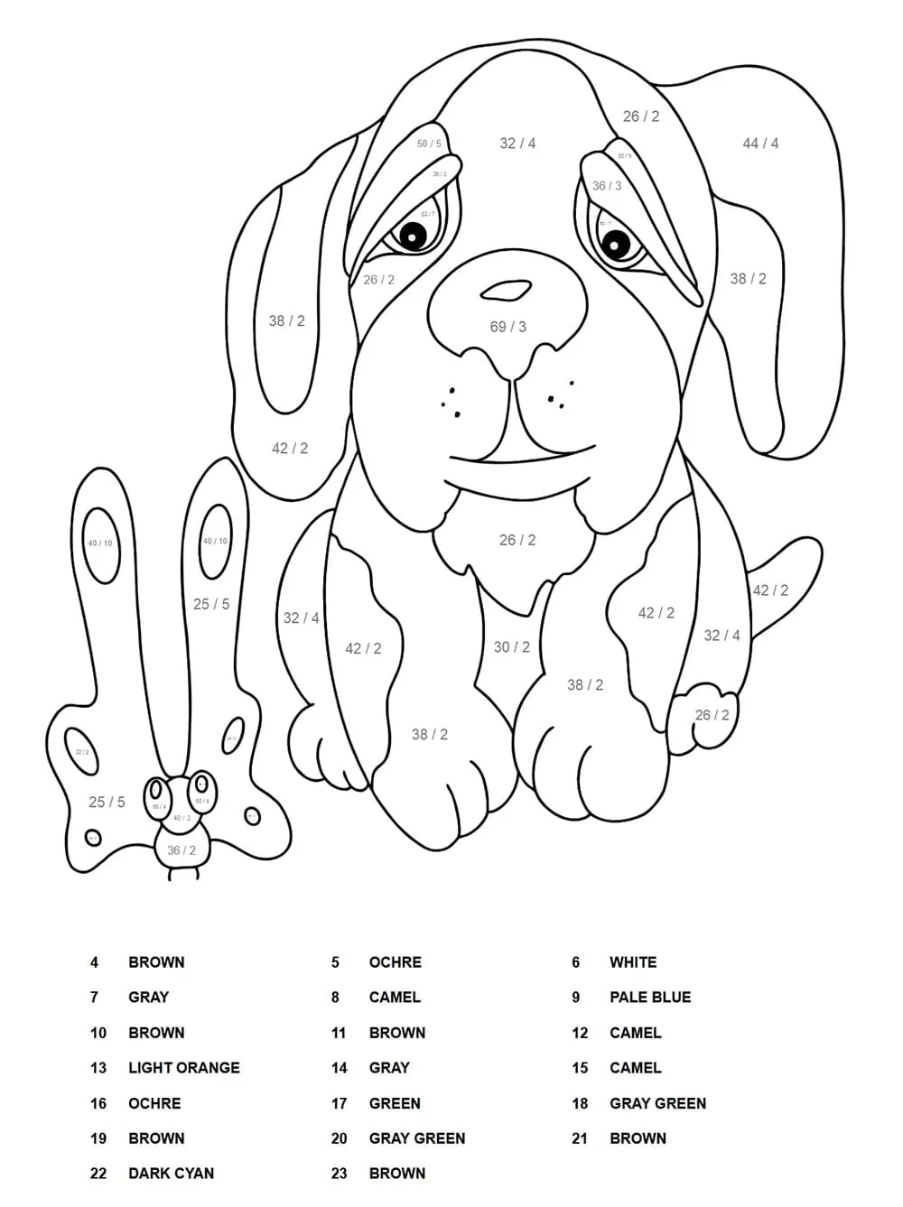 : Druckbar herunterladen Hundeteilung Farbe nach Zahl Malvorlage
