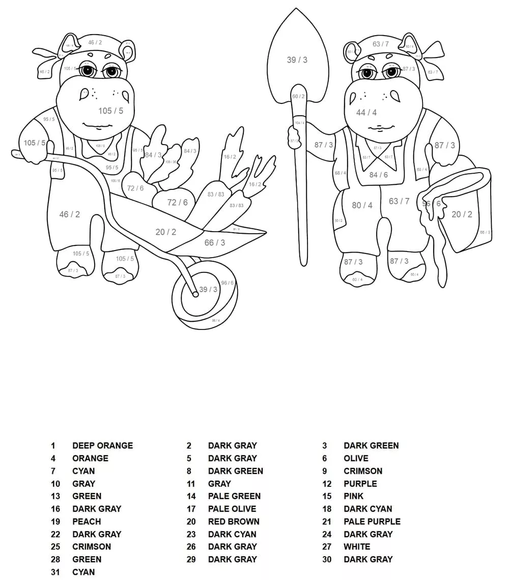 : Druckbar herunterladen Nilpferde Division Malen nach Zahlen Malvorlage