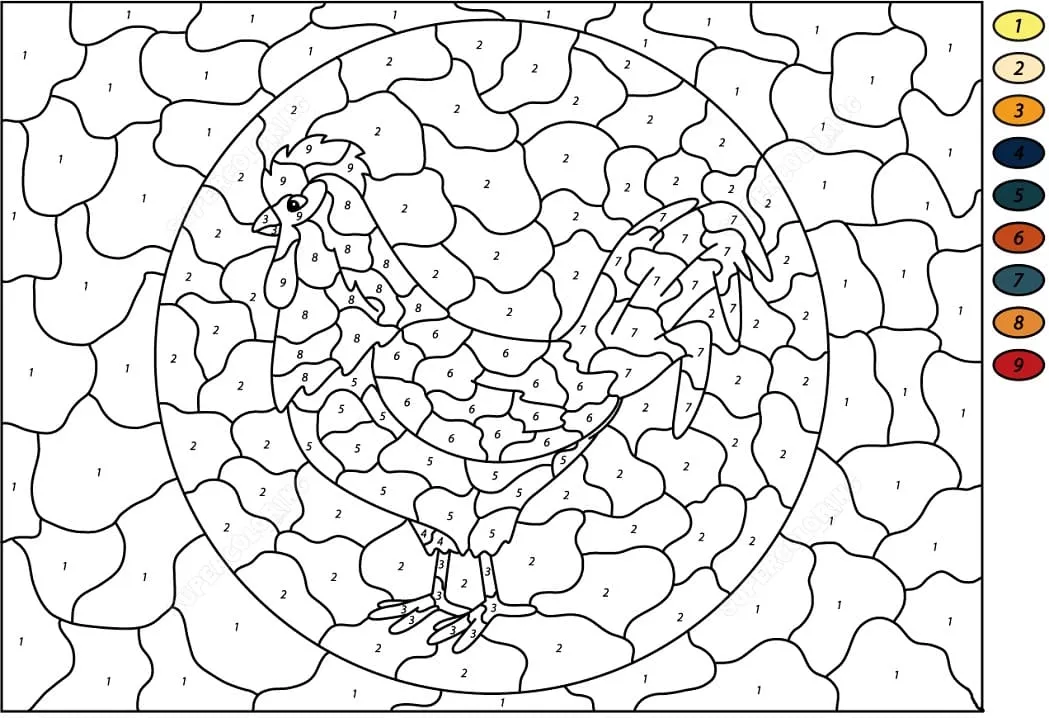 : Druckbar herunterladen Hahn Malen nach Zahlen Malvorlage