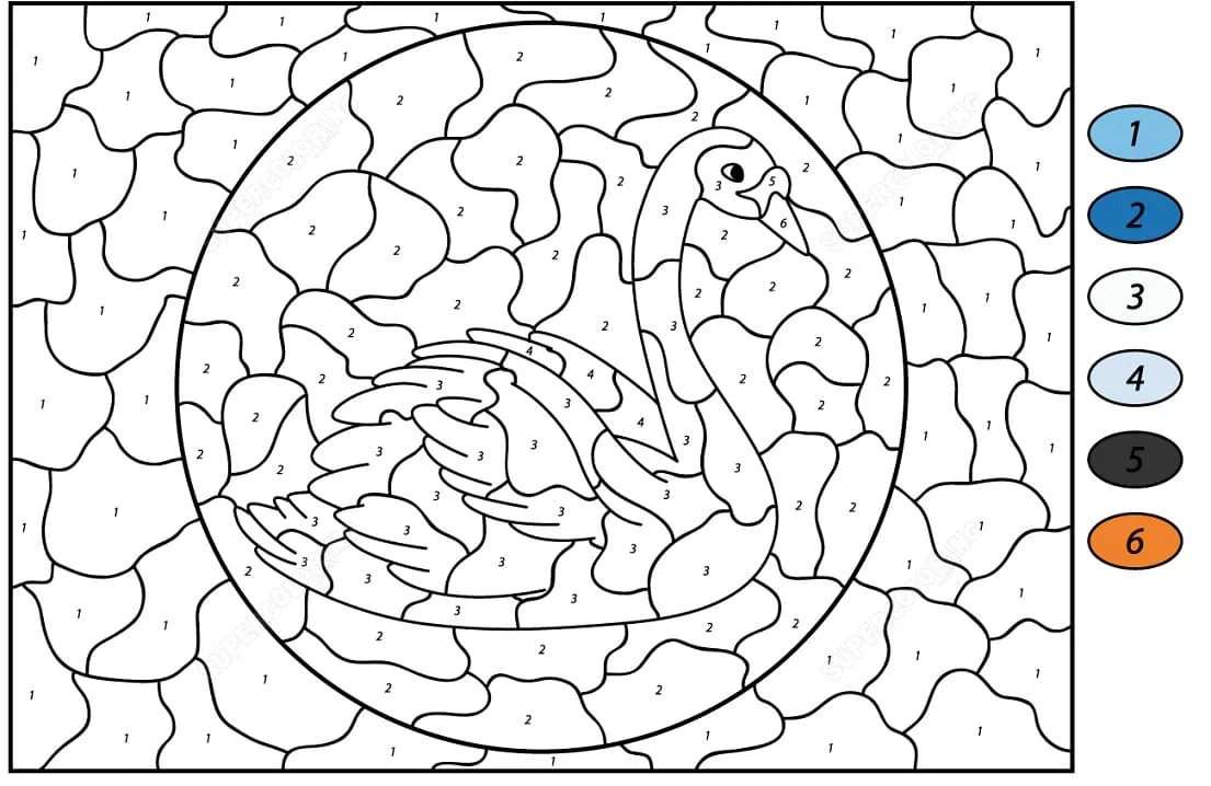 : Druckbar herunterladen Schwan Farbe nach Zahlen Malvorlage