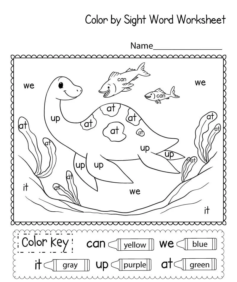 : Druckbar herunterladen Dinosaurier-Seh-Wörter Malvorlage