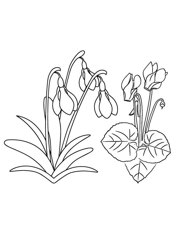 Beschreibung der Färbung : Druckbar herunterladen Schneeglöckchen-Kritzelei und Alpenveilchen-Weihnachtsblumen Malvorlage