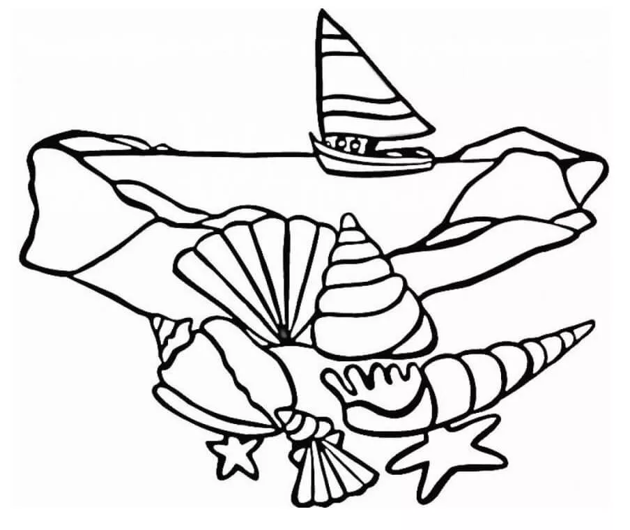 : Druckbar herunterladen Boat and Seashells Malvorlage