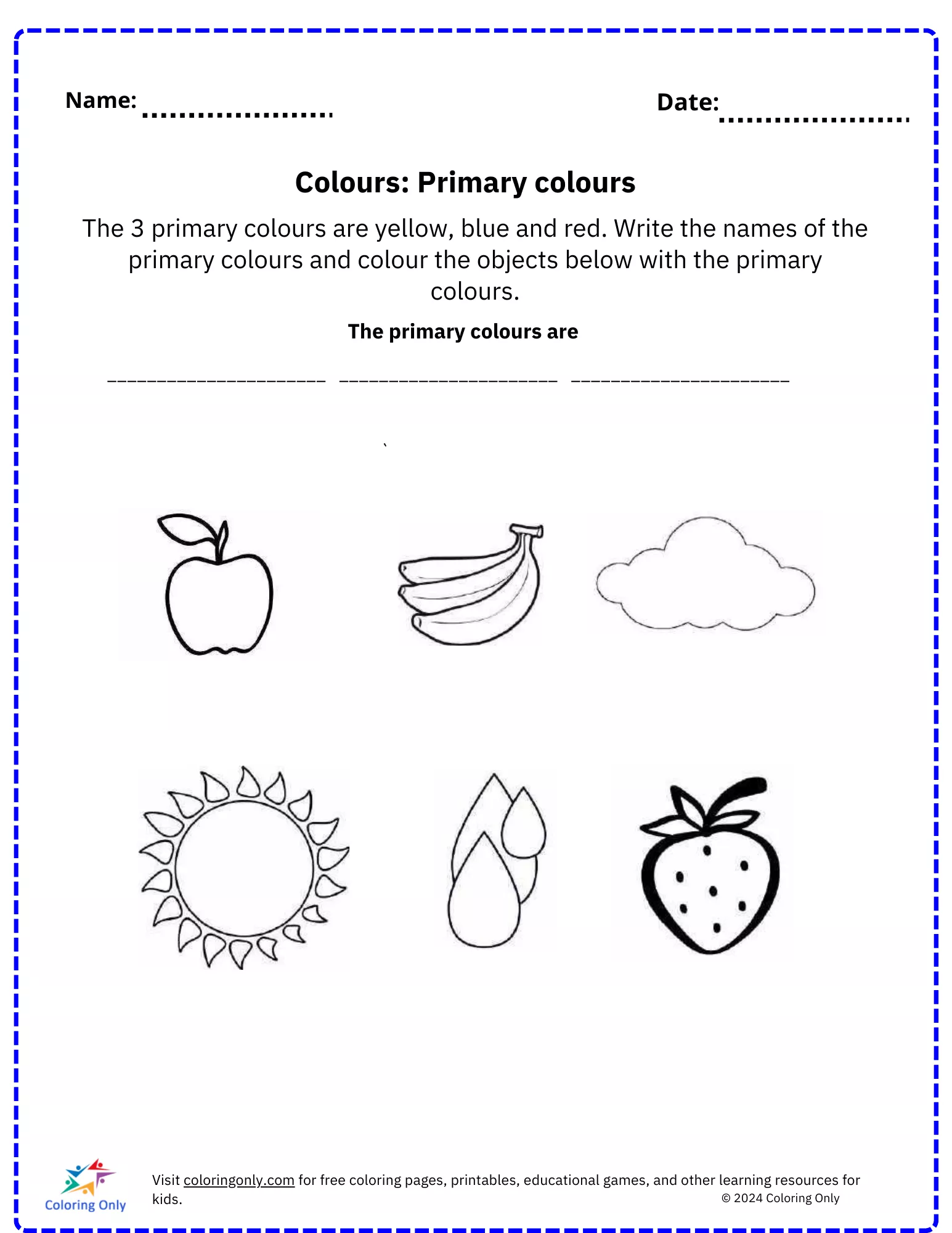 Beschreibung der Färbung : Druckbar herunterladen Colours: Primary colours free Printable Worksheet Malvorlage