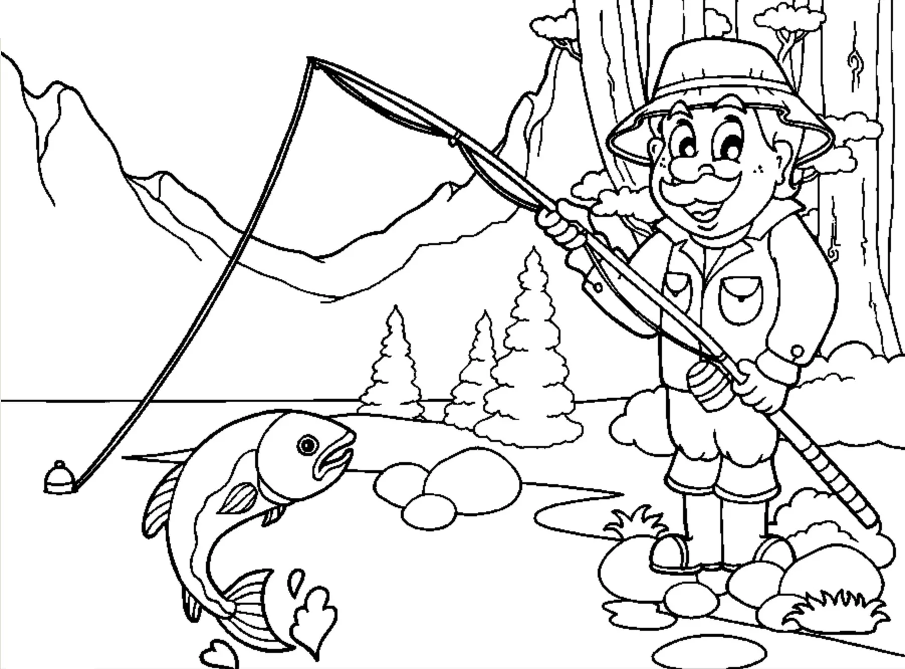 : Druckbar herunterladen Fischer in einer Seenlandschaft Malvorlage