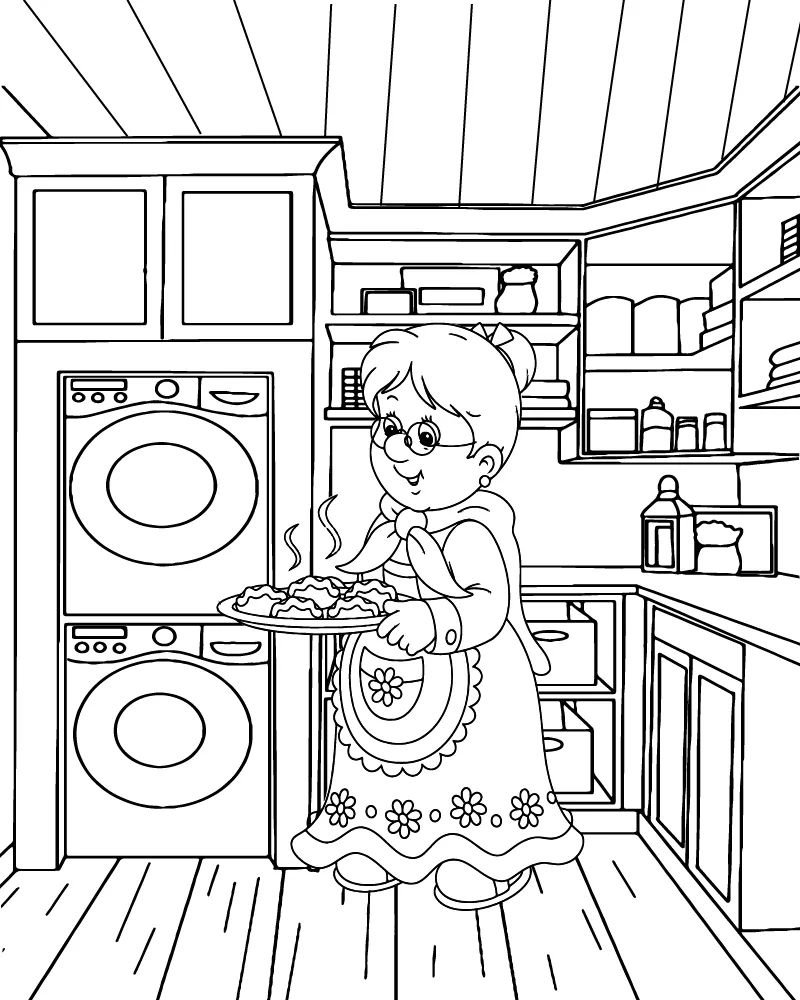Beschreibung der Färbung : Druckbar herunterladen Oma bereitet Essen in gemütlicher Küche zu Malvorlage