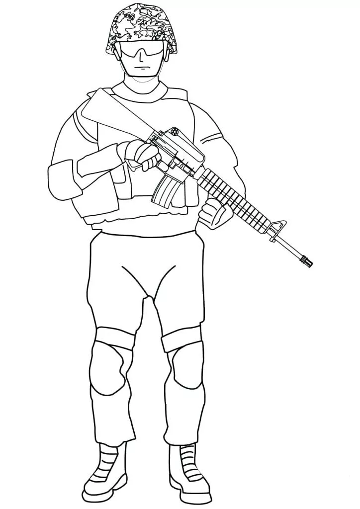 : Druckbar herunterladen Soldat mit einer Waffe Malvorlage