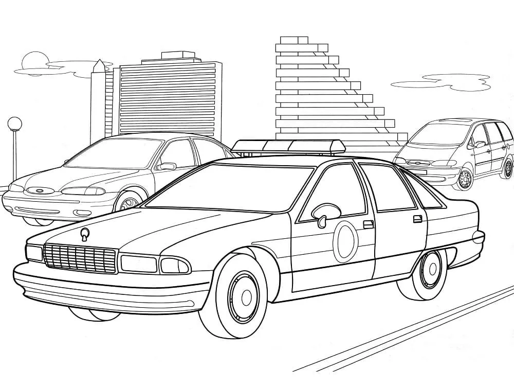 : Druckbar herunterladen Polizeiauto in der Stadt Malvorlage