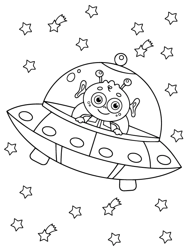 : Druckbar herunterladen Niedliches Alien in einem Raumschiff Malvorlage