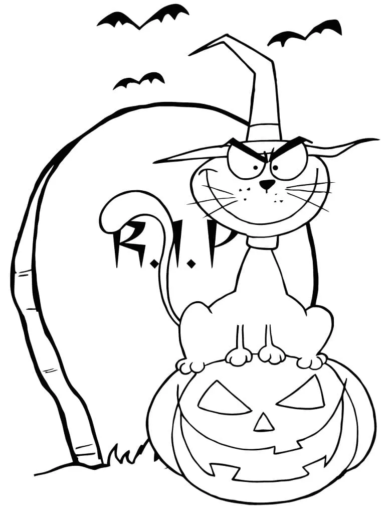 : Druckbar herunterladen Halloween-Katze lächelt Malvorlage