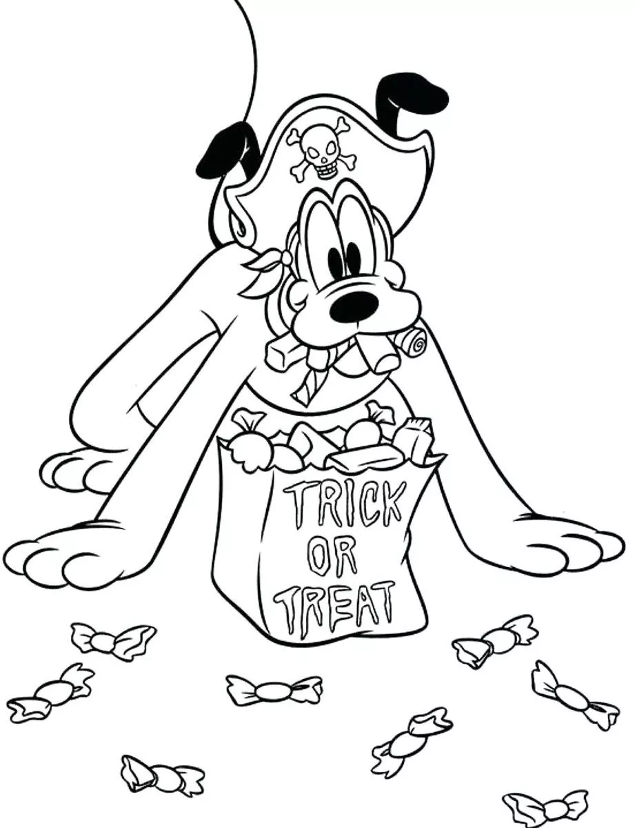 Beschreibung der Färbung : Druckbar herunterladen Pluto im Piratenkostüm und mit Süßigkeitentüte Malvorlage