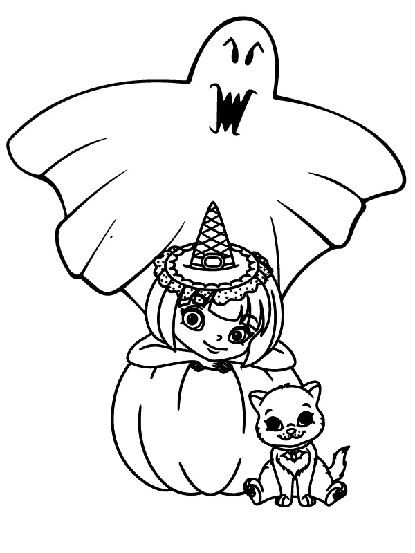 Katze auf Kürbis und Halloween-Hexenmädchen