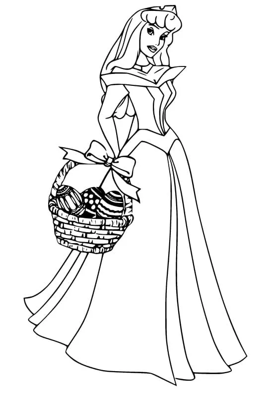 : Druckbar herunterladen Prinzessin Aurora mit Osterkörbchen Malvorlage