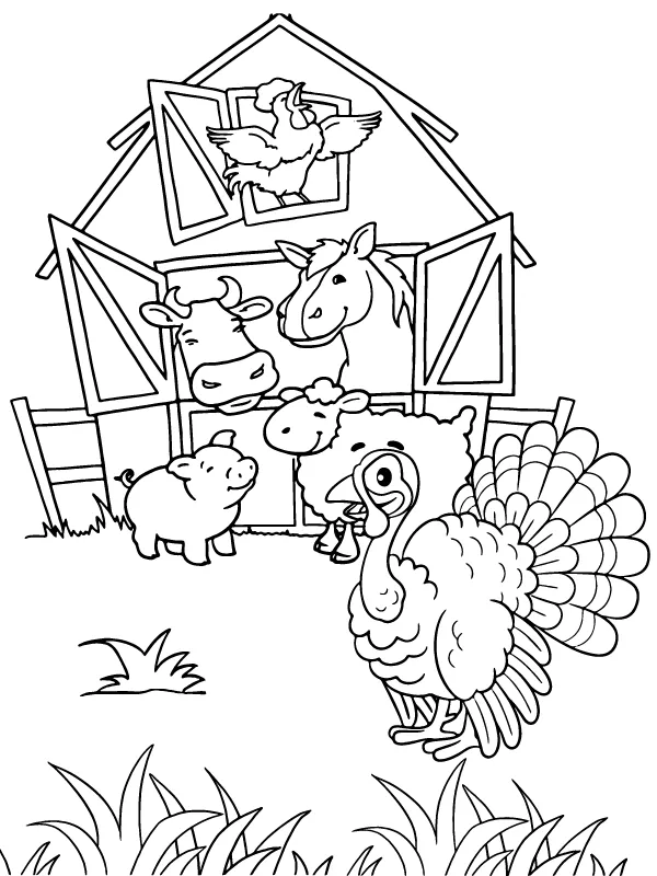 : Druckbar herunterladen Niedlicher Truthahn und Freunde Malvorlage