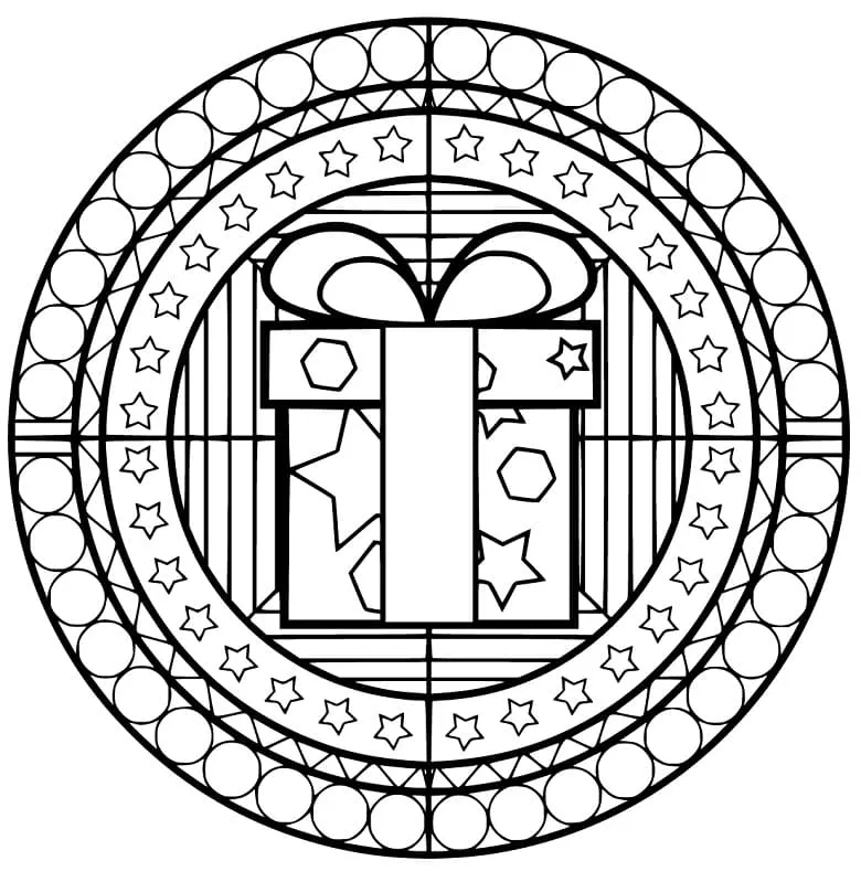: Druckbar herunterladen Weihnachtsmandala und Geschenk Malvorlage