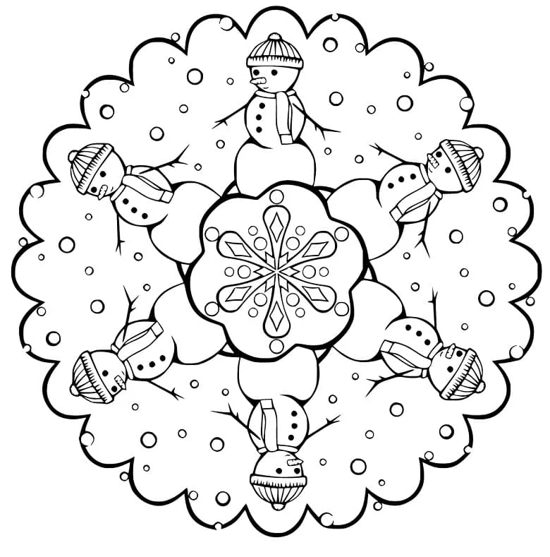 : Druckbar herunterladen Weihnachtsmandala mit Schneemännern Malvorlage