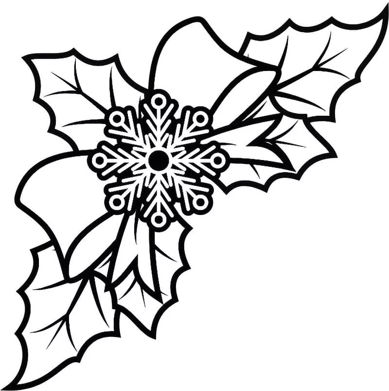 : Druckbar herunterladen Weihnachtsstechpalme und Schneeflocke Malvorlage