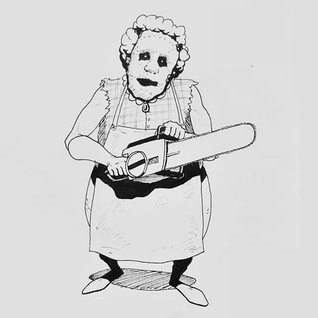 : Druckbar herunterladen Granny Holding Chainsaw Malvorlage