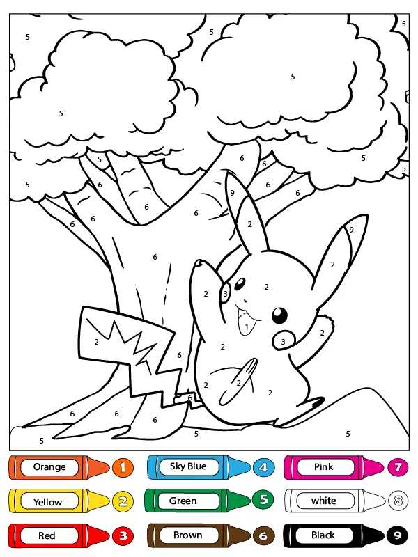 Beschreibung der Färbung : Druckbar herunterladen Pikachu lehnt sich an den Baum Farbe nach Zahl Malvorlage