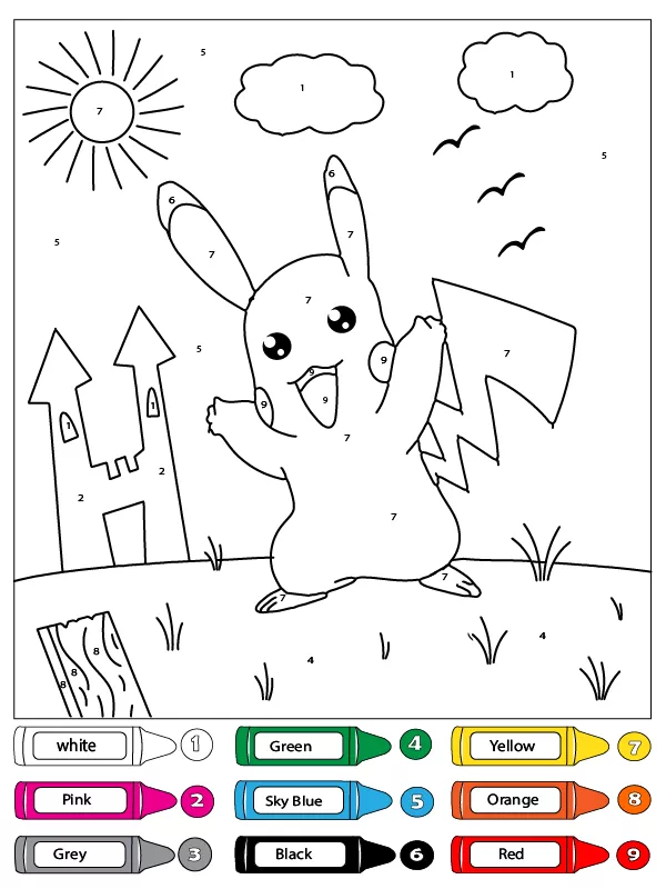 Beschreibung der Färbung : Druckbar herunterladen Pikachu vor dem Schloss Malen nach Zahlen Malvorlage
