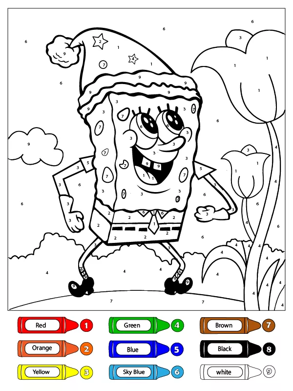 Beschreibung der Färbung : Druckbar herunterladen SpongeBob mit Hut zum Ausmalen nach Zahlen Malvorlage
