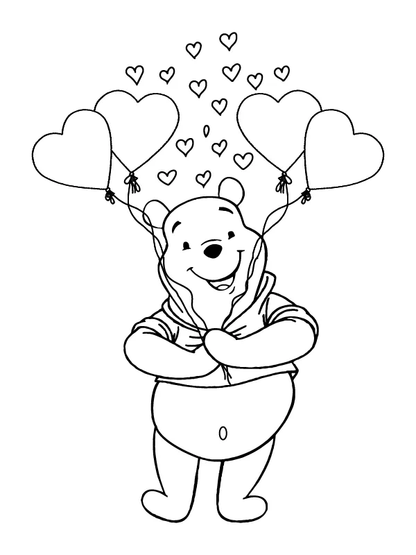 : Druckbar herunterladen Winnie Puuh mit Herzballons Malvorlage
