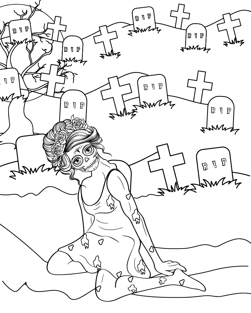 : Druckbar herunterladen Zombie-Mädchen im Friedhof Malvorlage