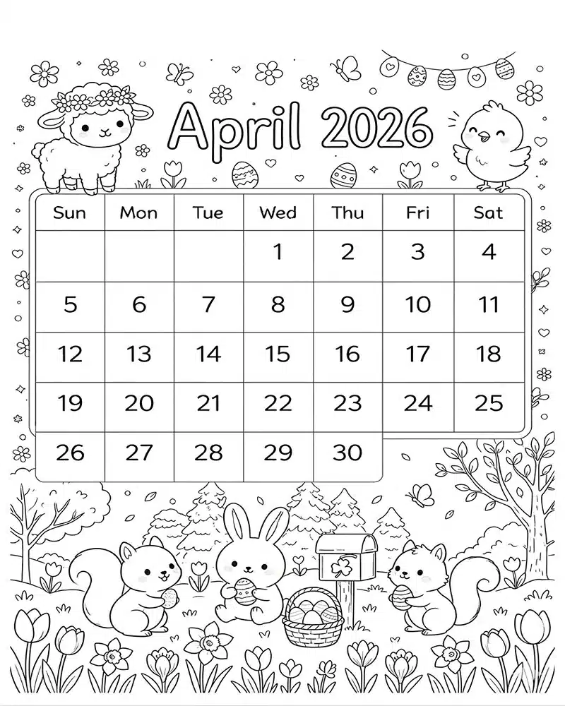 : Druckbar herunterladen April 2026 für Kinder Malvorlage
