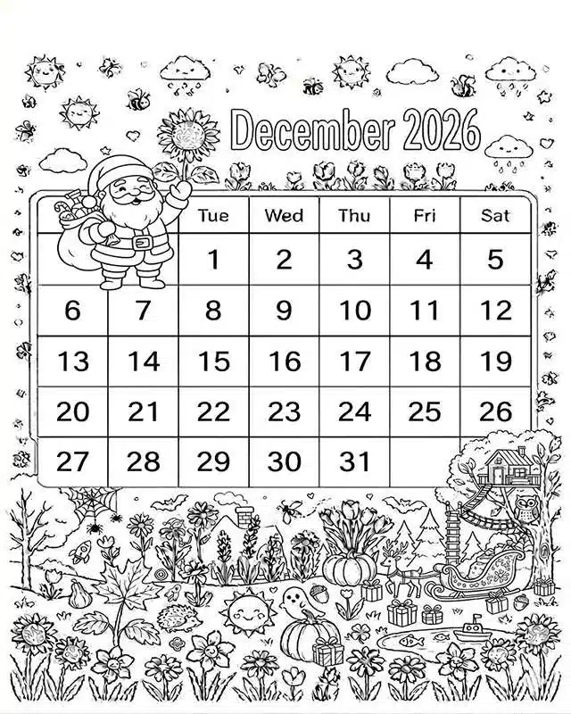 : Druckbar herunterladen Dezember 2026 für Kinder Malvorlage