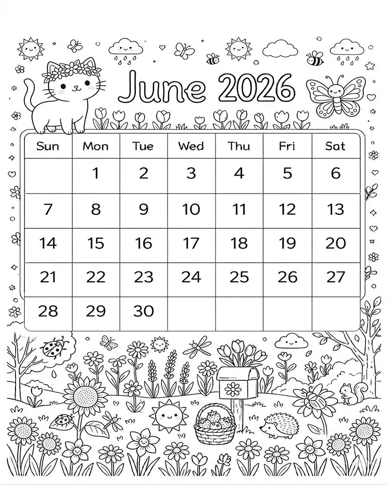 : Druckbar herunterladen Juni 2026 für Kinder Malvorlage