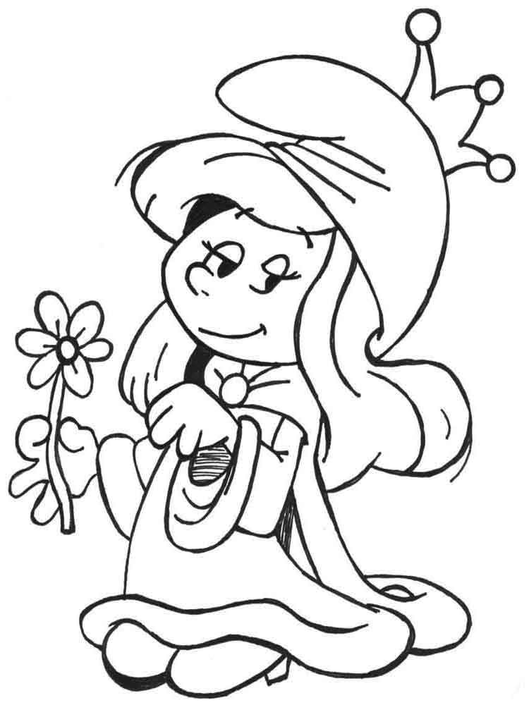 : Druckbar herunterladen Schlumpfine mit Blume Malvorlage