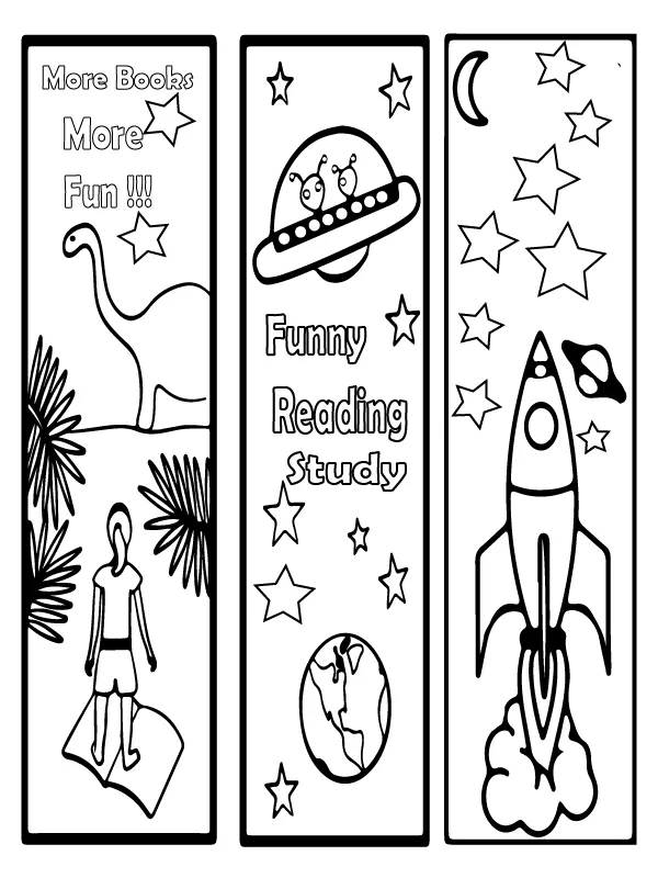 Beschreibung der Färbung : Druckbar herunterladen Dinosaurier, Raumschiff und Rakete Lesezeichen für Kinder Malvorlage