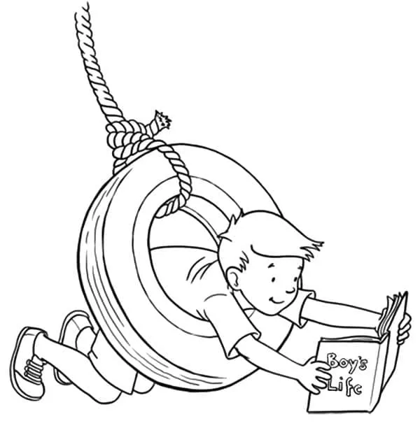 : Druckbar herunterladen Junge auf Reifenschaukel Malvorlage