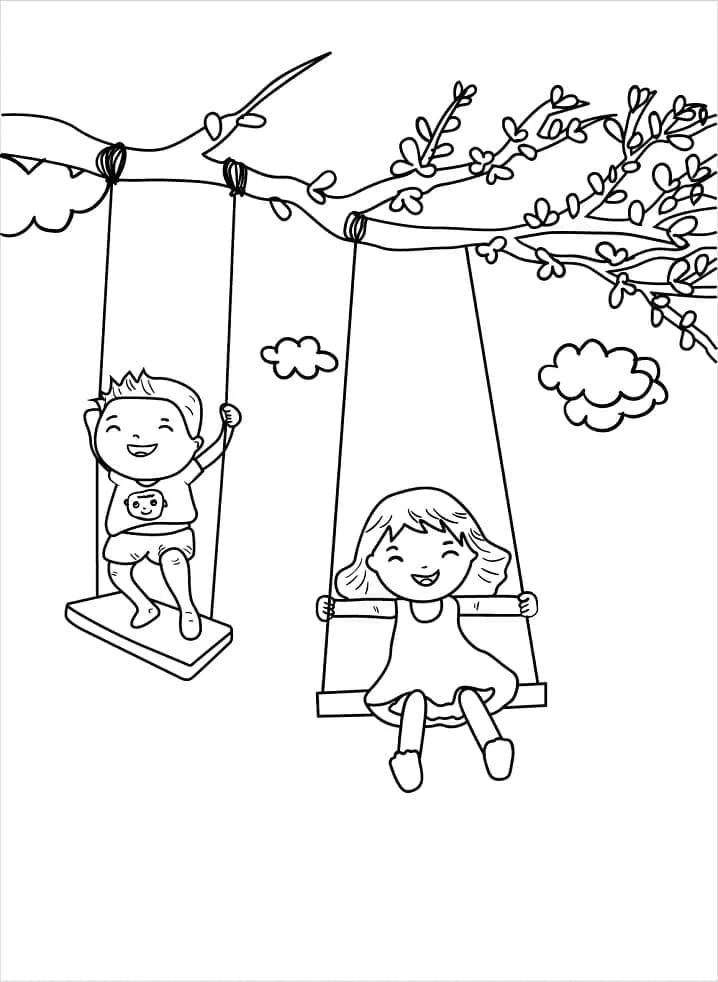 : Druckbar herunterladen Kinder auf Schaukel Malvorlage