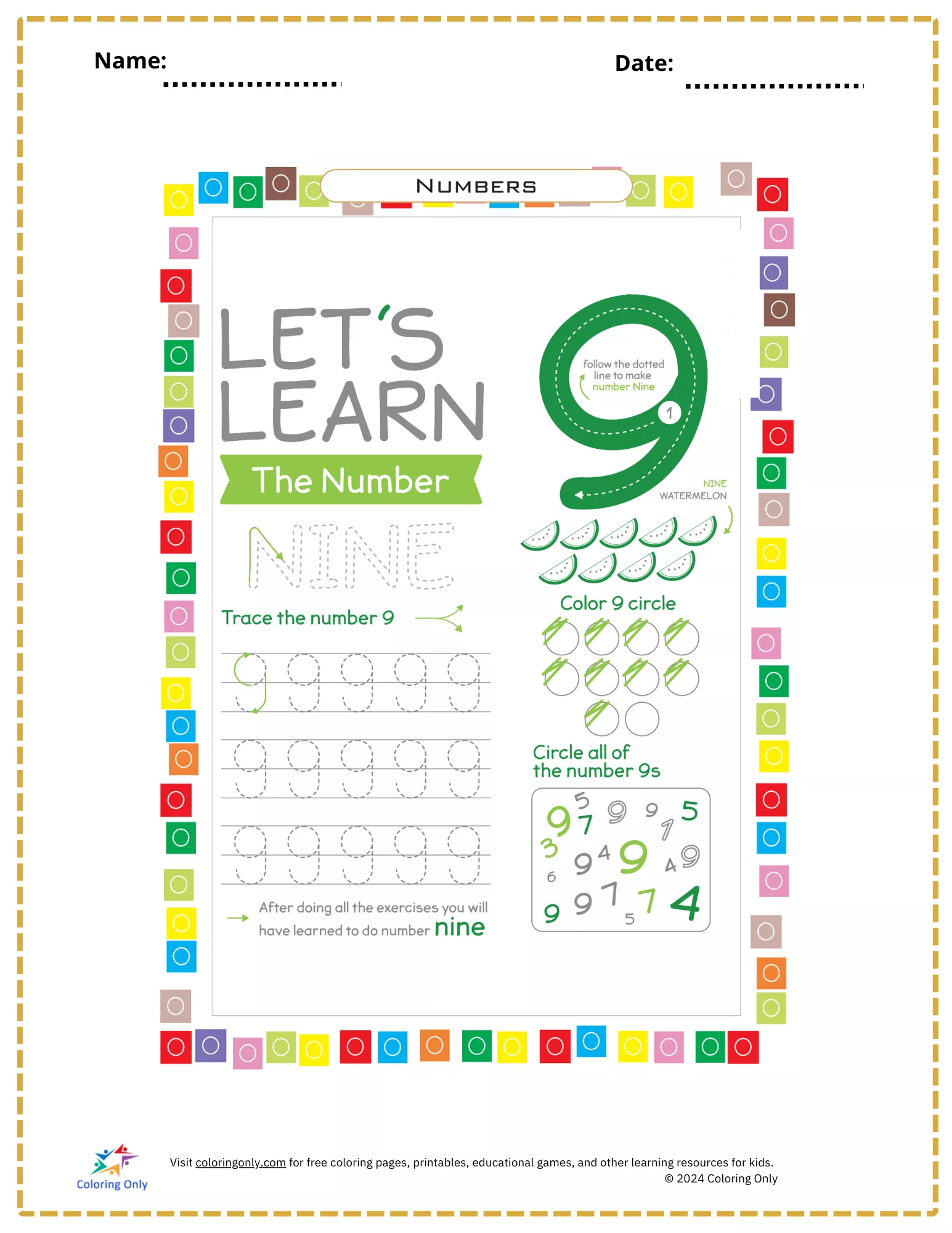 Beschreibung der Färbung : Druckbar herunterladen Let’s Learn Number- 9 Free Printable Worksheet Malvorlage