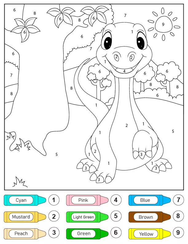 : Druckbar herunterladen Lovable Crawling Dino Color by Number Malvorlage
