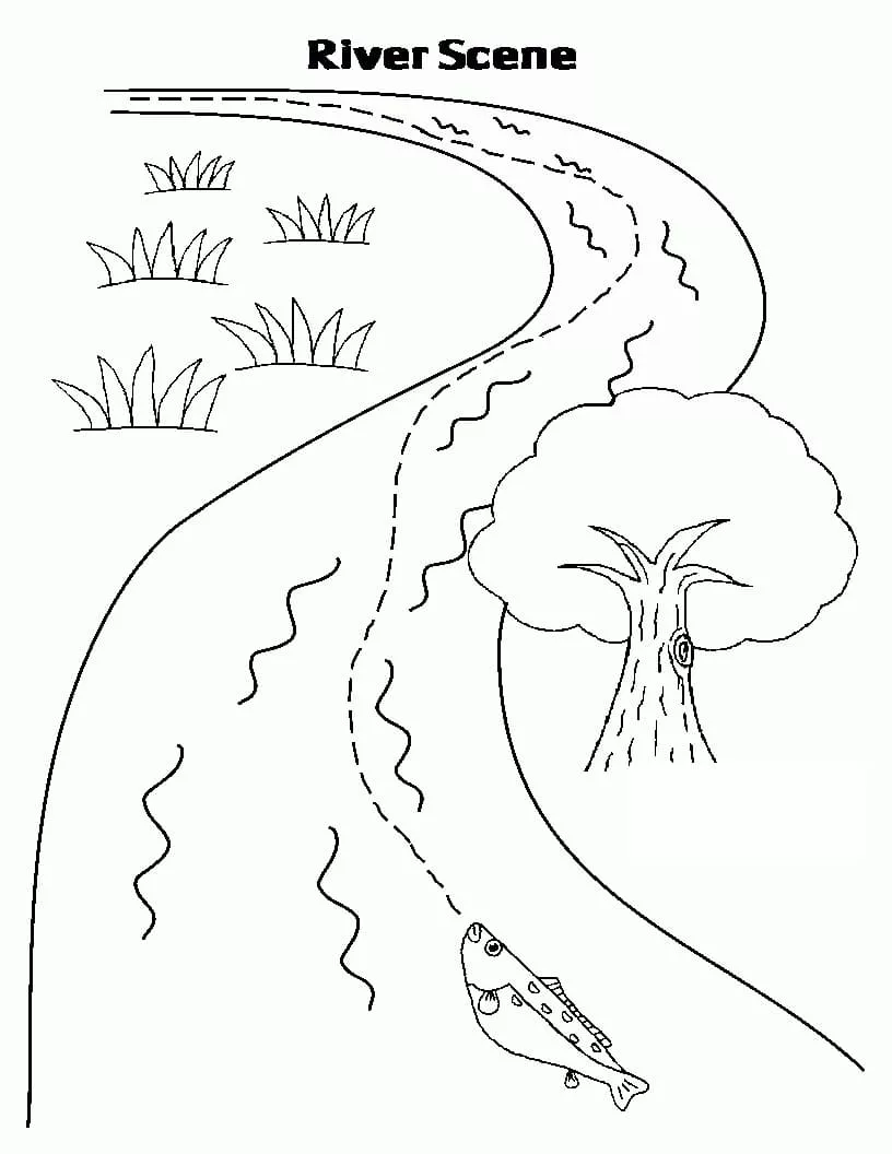 : Druckbar herunterladen Druckbare Flussszene Malvorlage