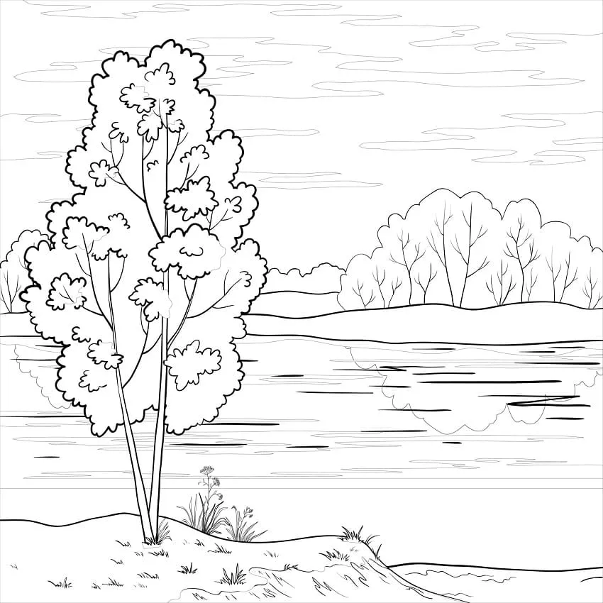 : Druckbar herunterladen Bäume und Fluss Malvorlage