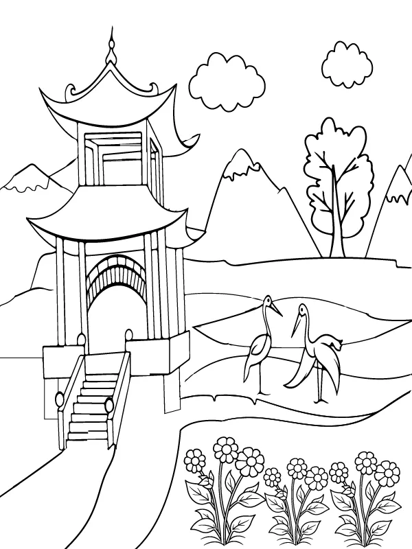 : Druckbar herunterladen Chinesischer Tempel und Natur Malvorlage