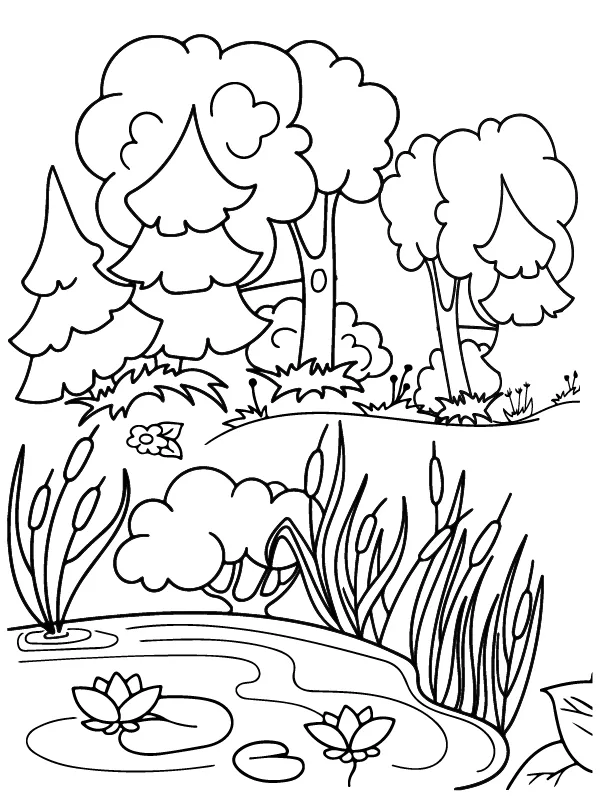 : Druckbar herunterladen Ruhiger Waldteich Malvorlage