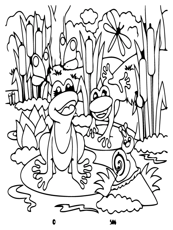 : Druckbar herunterladen Wald Fröhliche Frösche und Insekten Malvorlage