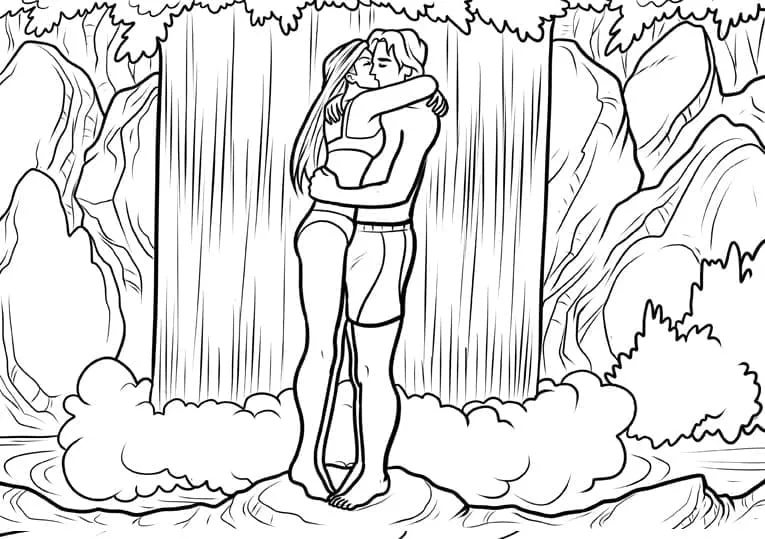 : Druckbar herunterladen Kussszene Wasserfall Malvorlage