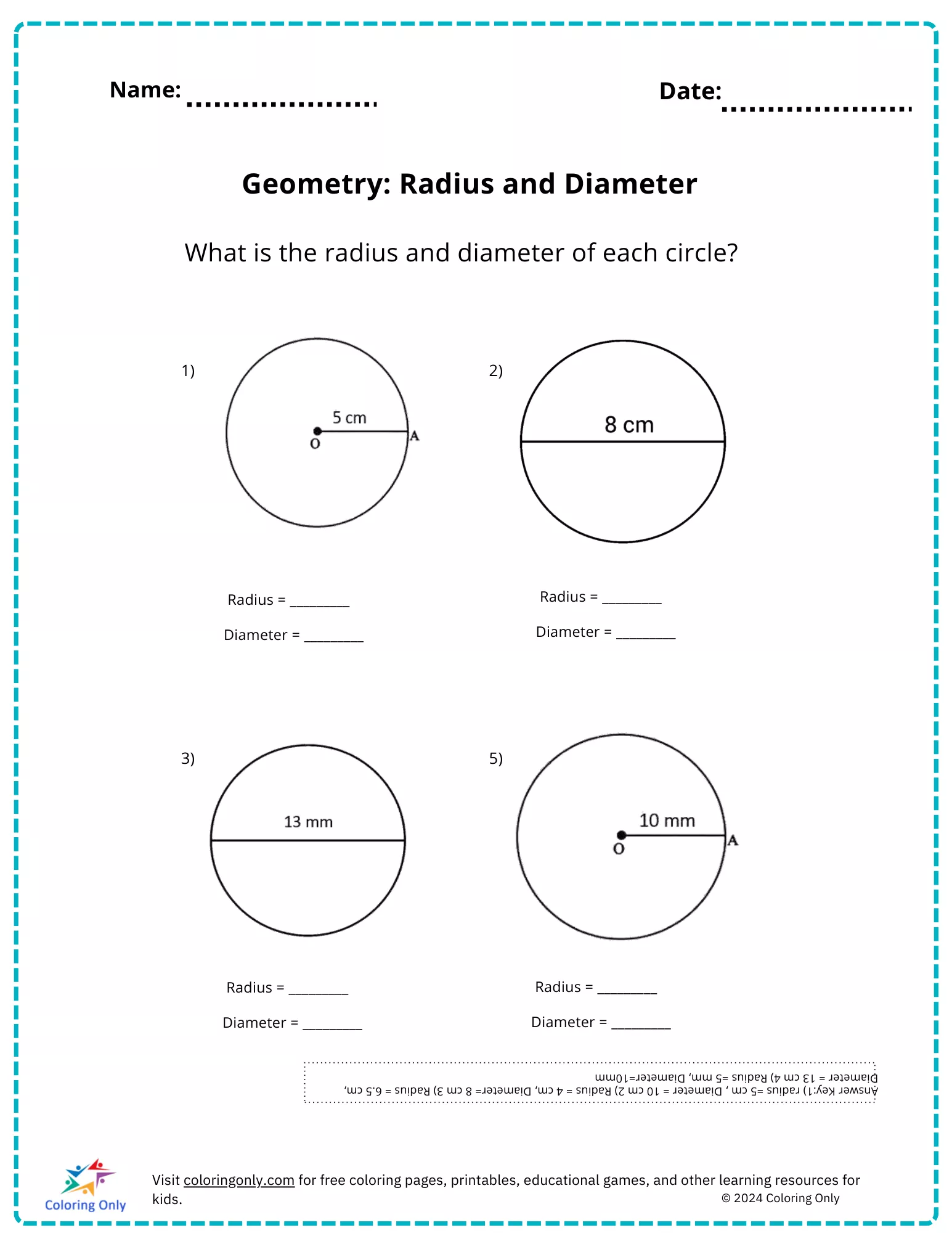 Das kostenlose druckbare Arbeitsblatt Geometrie: Radius und Durchmesser soll Grundschülern helfen, die Beziehung zwischen Radius und Durchmesser eines Kreises zu verstehen. Durch die visuelle Darstellung werden die Schüler in der Lage sein, beide Maße für jeden gegebenen Kreis zu berechnen und zu identifizieren. Dieses ansprechende Arbeitsblatt fördert kritisches Denken und stärkt grundlegende Geometriekonzepte. Das kostenlos druckbare Arbeitsblatt "Geometrie: Radius und Durchmesser " eignet sich perfekt für Übungen im Klassenzimmer, Hausaufgaben oder ergänzende Übungen und macht das Lernen für junge Schüler unterhaltsam und einfach.
