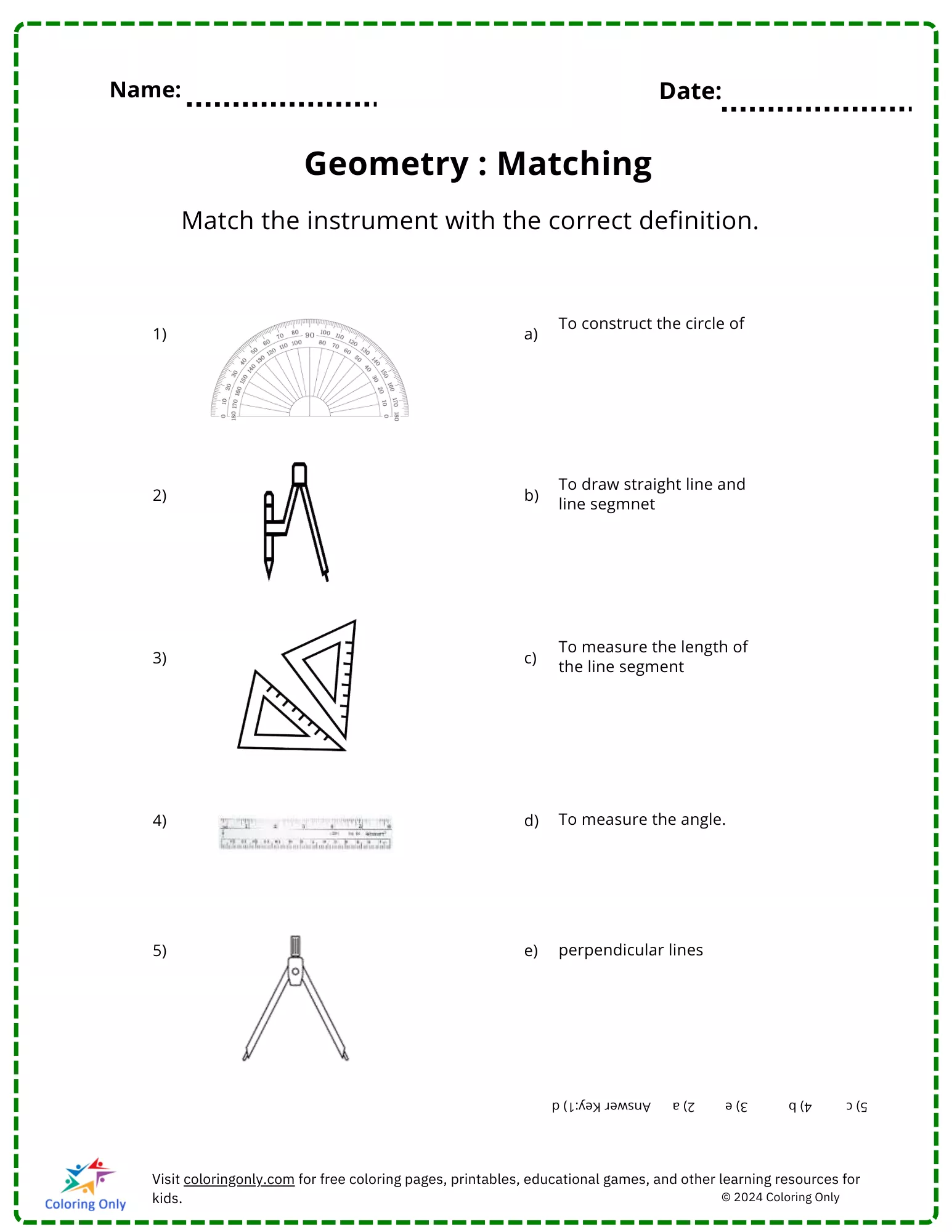 Das kostenlose druckbare Arbeitsblatt "Geometrie: Passendes druckbares Arbeitsblatt " soll Grundschülern helfen, sich mit gängigen Geometrieinstrumenten vertraut zu machen. Die Schülerinnen und Schüler ordnen jedem Werkzeug, wie z. B. einem Winkelmesser, einem Zirkel und einem Lineal, die entsprechende Funktion zu. Dieses Arbeitsblatt erweitert nicht nur ihr Wissen über Geometriewerkzeuge, sondern hilft auch, ihre Fähigkeiten zum kritischen Denken zu verbessern. Dieses kostenlose druckbare Arbeitsblatt Geometrie eignet sich perfekt für Aktivitäten im Unterricht oder bei den Hausaufgaben und bietet Kindern eine unterhaltsame und interaktive Möglichkeit, mehr über die in der Geometrie verwendeten Werkzeuge zu erfahren.