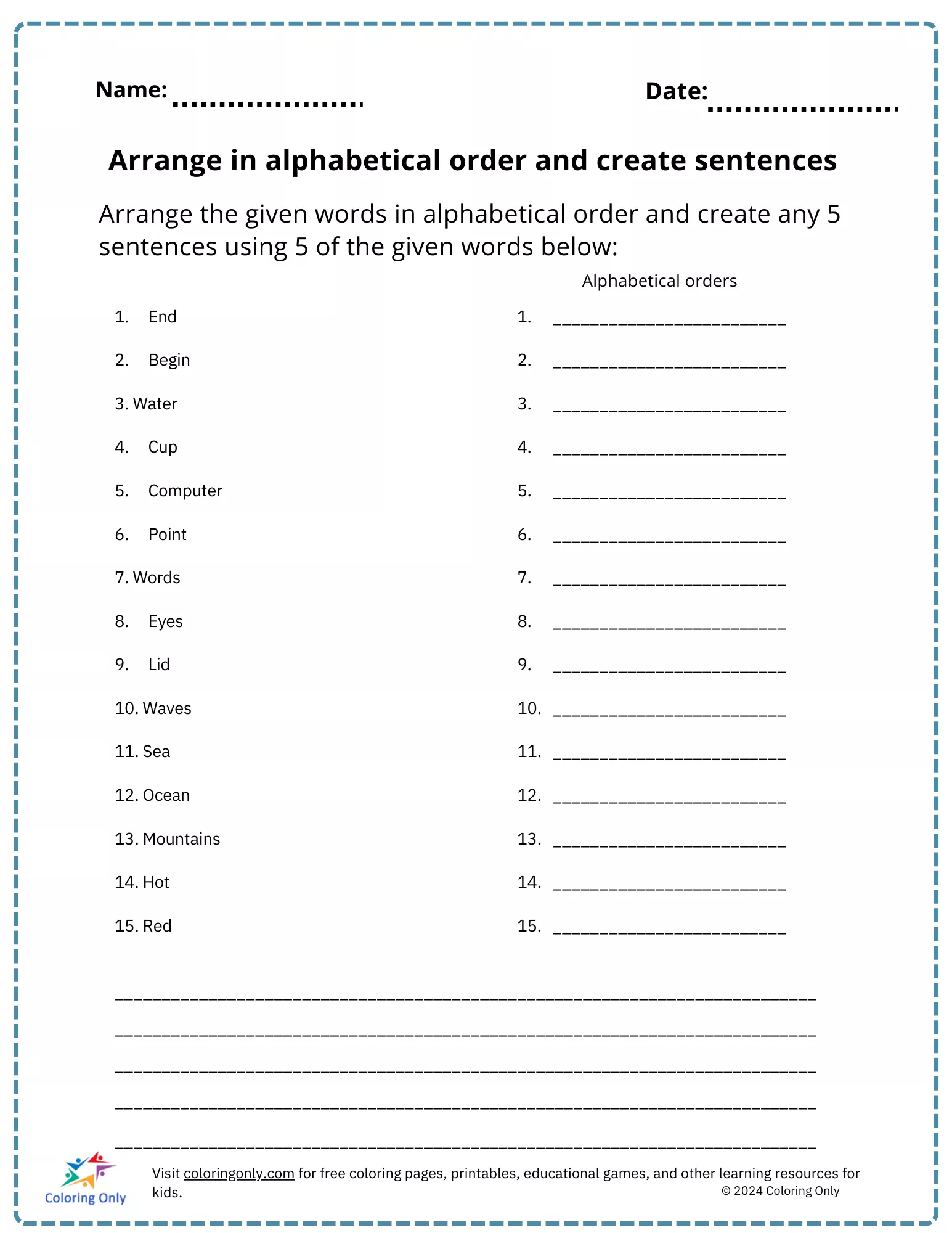 Heim » Elementary » Englisch » Ordnen Sie in alphabetischer Reihenfolge an und erstellen Sie Sätze Kostenloses druckbares Arbeitsblatt